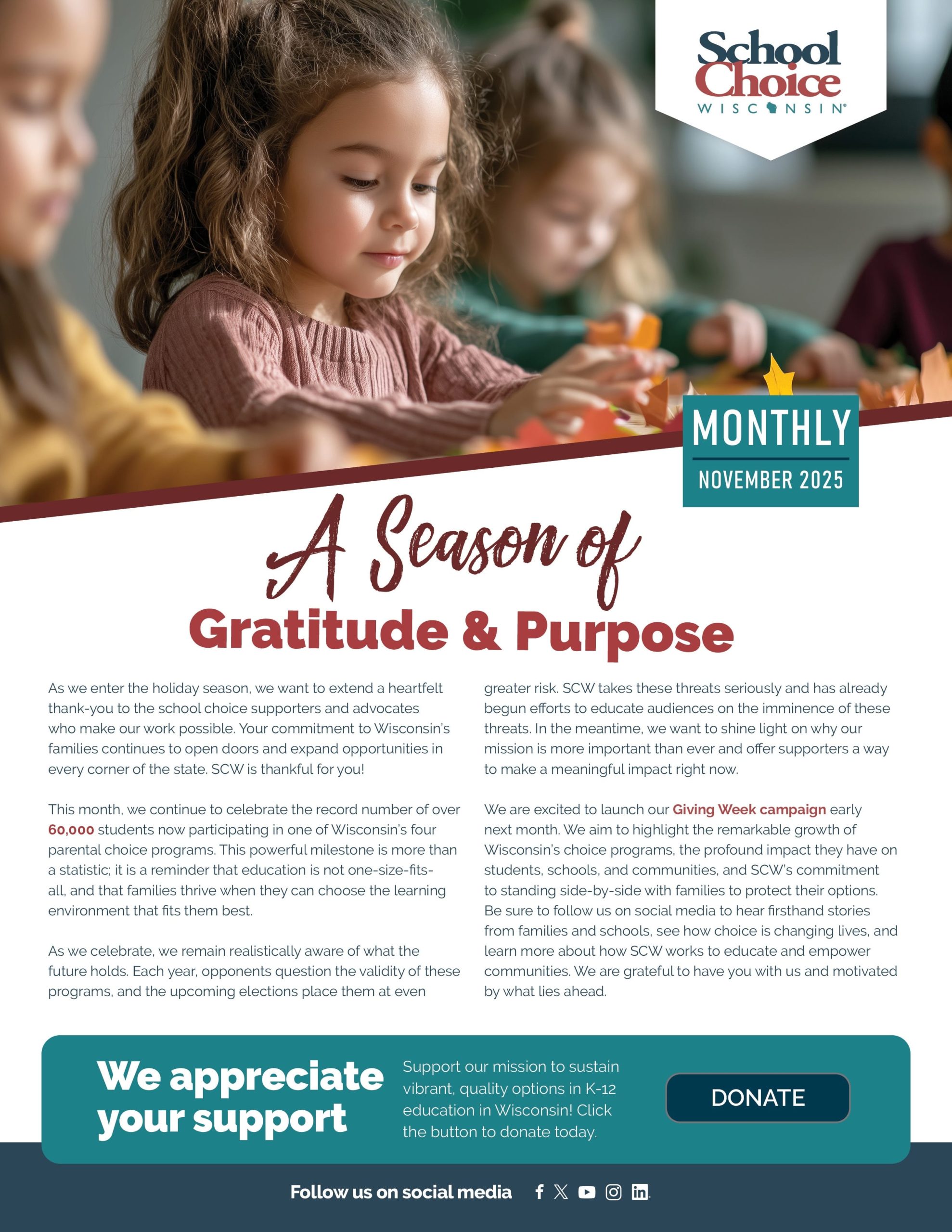 Download School Choice Wisconsin’s latest newsletter: SCW Monthly – November 2025, Volume 15.